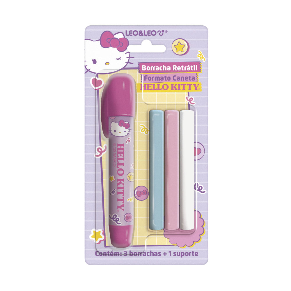 Prática, bonita e funcional, a Borracha Caneta Retrátil Hello Kitty Blister com 1 Suporte e 3 Borrachas Leo&Leo é ótima para apagar o que foi escrito ou rabiscado e precisa ser corrigido.