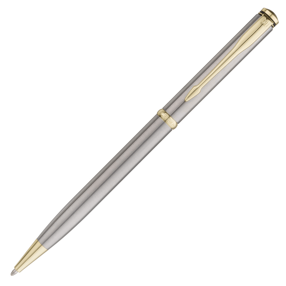Prata com acabamento escovado e detalhes dourados tem sua escrita com conforto e maciez. Mecanismo de torção e com carga esferográfica padrão Cross