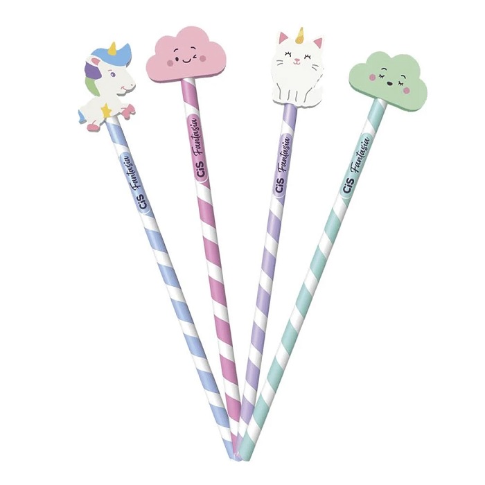Lápis de escrever decorado. Possui corpo redondo com desenhos variados e borracha divertida no topo.