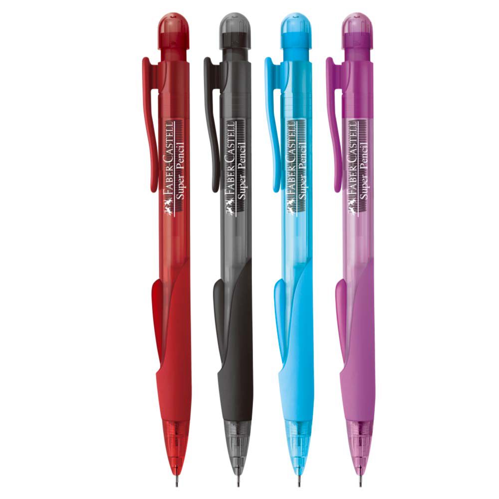 A Lapiseira Super Pencil da Faber-Castell possui cores super divertidas e 3 maneiras de acionar o grafite: click lateral, click superior ou por agito. Seu corpo possui grip emborrachado, que proporciona maior segurança e conforto na escrita. Possui borracha no topo da lapiseira com tampa protetora. Ideal para utilizar o grafite 0.7mm.