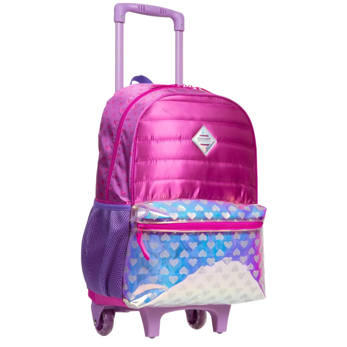 Uma mochila com uma linda estampa colorida, produzida em um resistente poliéster para te acompanhar na escola. As alças espumadas possuem regulagem, para o melhor ajuste no corpo, e o carrinho com rodinhas torna o transporte mais fácil e leve. Os bolsos laterais em redinha acompanham a paleta de cor da Mochilete, e o bolso frontal possui corações com glitter em um material holográfico.