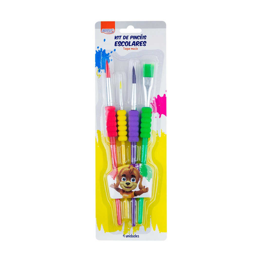 Blister com 4 cores vivas. Cerda sintética e na mesma cor do cabo. Área de pega macia, antideslizante e confortável. Ideal para uso escolar, artístico ou hobby.