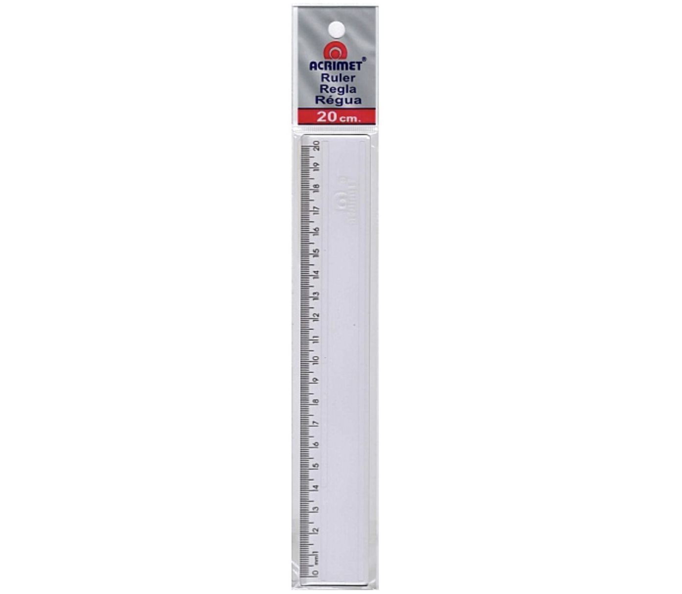 Régua em poliestireno, com escala de 20 cm gravada por transferência de imagem, garantindo alta precisão.