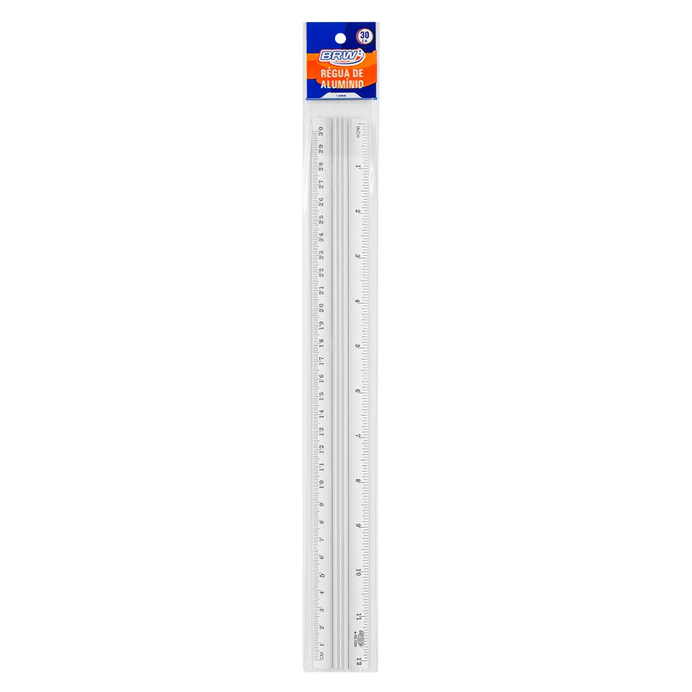 Régua de alumínio com escala de 30 cm do lado oposto escala em polegadas. Leve e resistente, ideal para uso escolar ou escritório.